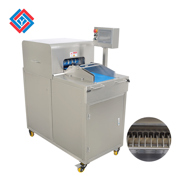 這款切肉丁機整體采用了不銹鋼制作,機身鋼板厚度達(dá)到了3mm,表面使用了拋光拉絲處理工藝,優(yōu)化衛(wèi)生方便清洗,切肉丁機的刀片是不銹鋼材質(zhì),特別淬火加工過后,可用鋒利的刀片將鮮肉開條再切塊,切割紅殺肉塊的肉丁迅速且大小均勻,機身同時還采用了快拆式刀組,方便更換加工其他肉類,省去了大量的人工成本。
